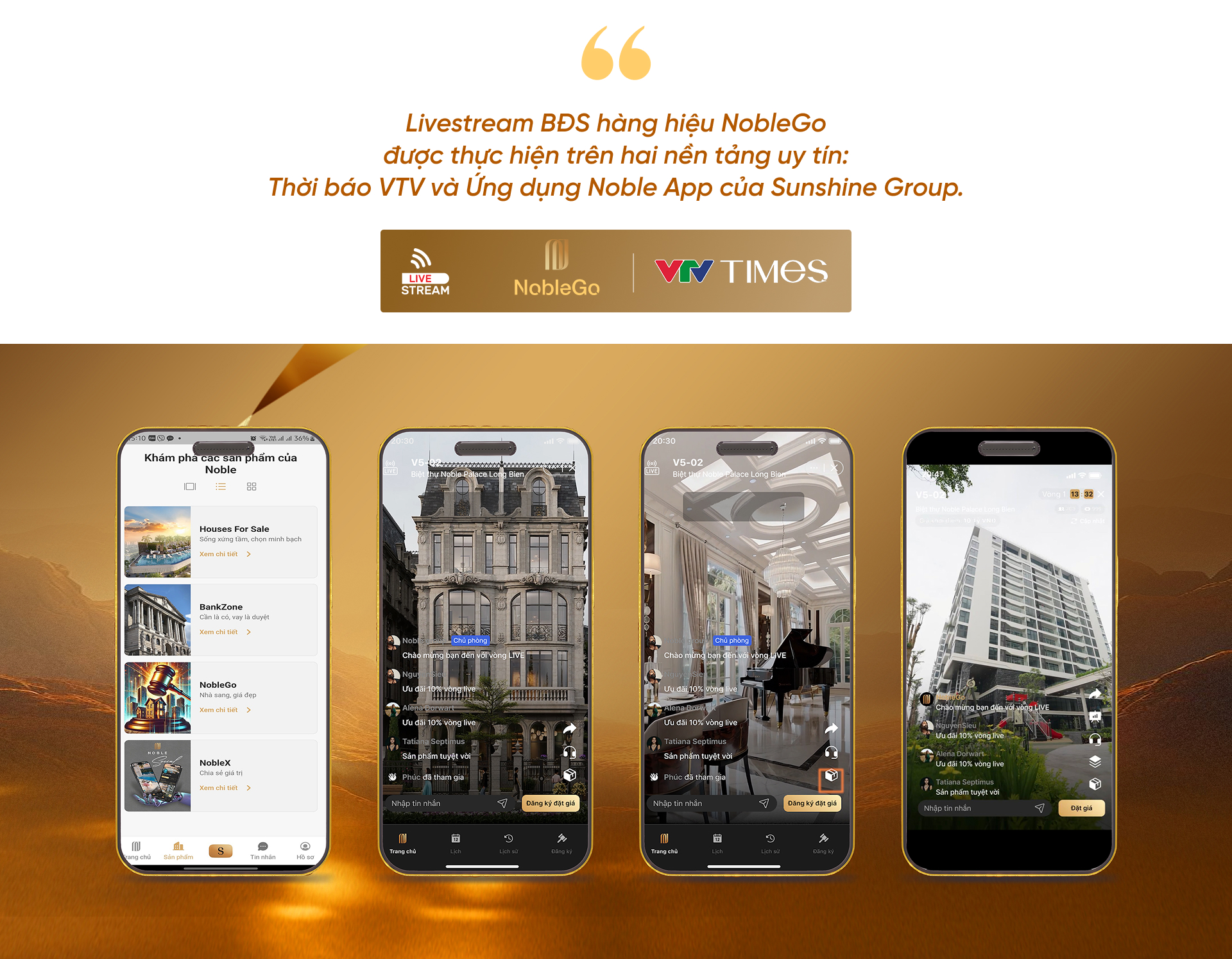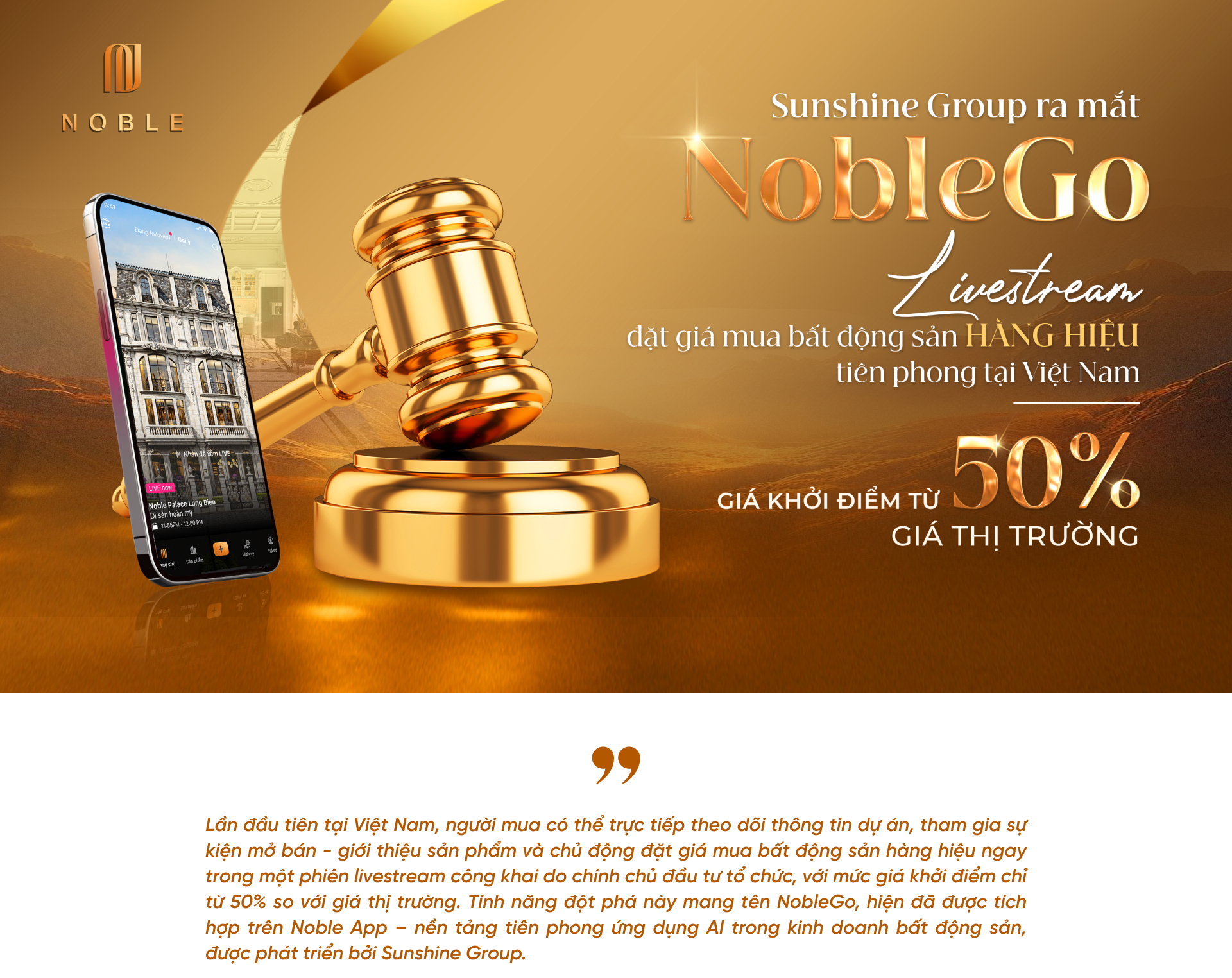 Đón đầu xu thế đó, Sunshine Group phát triển ứng dụng Noble App với định vị là nền tảng thông tin và giao dịch tiên phong ứng dụng AI trong lĩnh vực bất động sản cao cấp. Với sự ra mắt của tính năng NobleGo, nền tảng này tiếp tục khẳng định vị thế dẫn đầu khi lần đầu tiên đưa mô hình livestream kết hợp đặt giá mua nhà vào kinh doanh bất động sản hàng hiệu - mở ra một chuẩn mực giao dịch mới: trực tiếp, minh bạch, và linh hoạt hơn bao giờ hết. Chương trình sẽ phát trực tiếp lúc 15 giờ, chiều thứ Ba và thứ Sáu hàng tuần, với phiên livestream đầu tiên sẽ diễn ra từ ngày 1/7/2025 trên các nền tảng: ứng dụng Noble App (Mini app NobleGo), Thời báo VTV (VTVTimes).