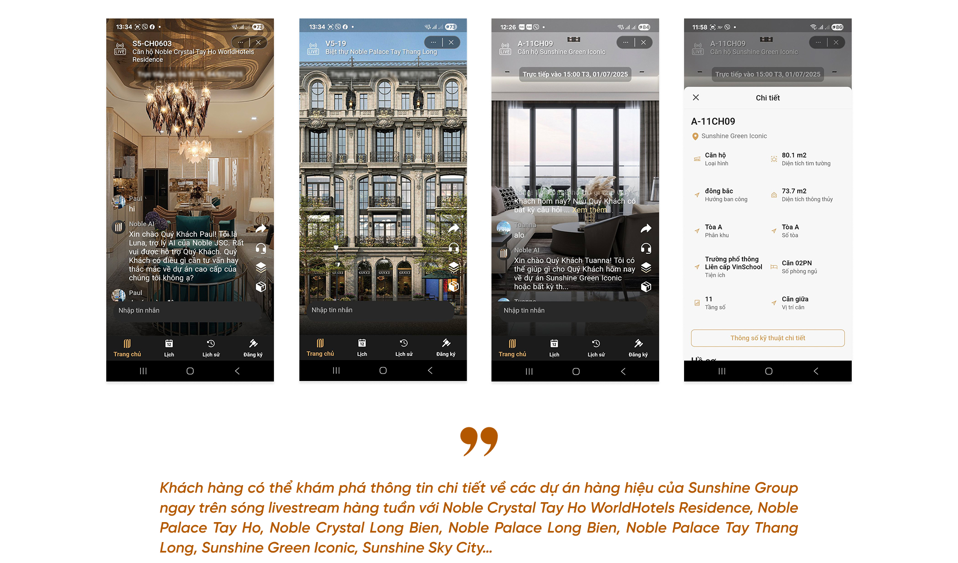 Cùng với Sunshine Green Iconic, các dự án bất động sản hàng hiệu khác của Sunshine Group như Noble Crystal Tay Ho WorldHotels Residence, Noble Palace Long Bien, Noble Crystal Long Bien, Noble Palace Tay Thang Long, Noble Palace Tay Ho, Sunshine Golden River và Sunshine Sky City…. cũng sẽ lần lượt xuất hiện trên các phiên livestream định kỳ, góp phần gia tăng cơ hội sở hữu bất động sản hàng hiệu theo cách thức mới trong thời gian tới.
