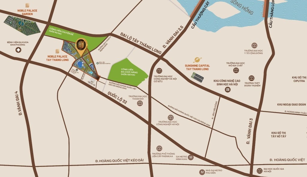 Chính vì vậy, Noble Palace Tay Thang Long WorldHotels Residences đang trở thành “hàng hiếm” khi tọa lạc tại “tứ giác vàng” tạo nên nhờ sự giao cắt hoàn hảo của 4 trục đường huyết mạch là Đại lộ Tây Thăng Long, Quốc lộ 32, Vành đai 4 và Vành đai 3.5 (trong bán kính chỉ khoảng 1km-2km) cùng lợi thế phong thuỷ trên trục thần đạo Hồ Tây – Ba Vì.
